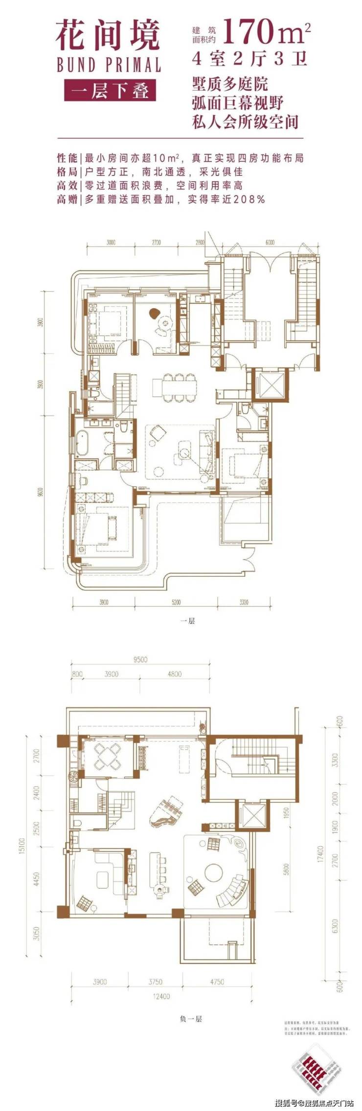 一楼户型附赠花园和超大地下室,地下室还配置两个采光内庭院;二楼户型附赠转角星空露台;三楼附赠露台及其他空间。计算附赠空间后,主力户型三层的实得率能达到约114-210%。