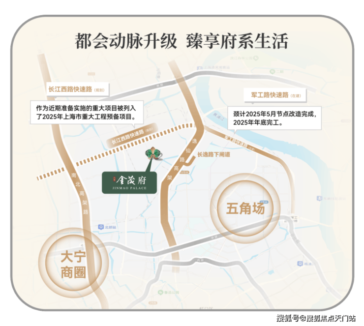 另一方面,军工路快速路新建工程预计今年年内完工(来源:上海发布),意味中环北抬今年将迈出重要一步,第二步 长江西路快速路已被列入2025年上海市重大工程清单,预计即将开工——届时,江湾金茂府就将从“中环旁”升级为“中环内”!