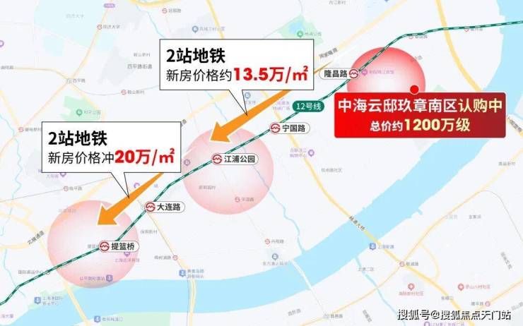 但你看地图,2站地铁,单价上涨约2万!再2站地铁,绿城北外滩项目的价格预计要20万/㎡,单价几乎是云邸玖章的2倍!