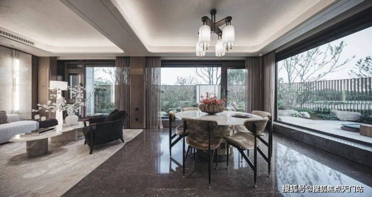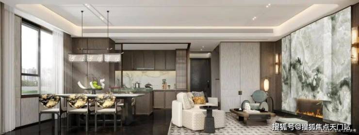 首先是奢石含量极高,从入户处的玲珑玉拼花与透光云石辉映,到翡翠绿奢石墙景、再到 发光云石装饰点亮归家路,石材的典雅贯穿始终。