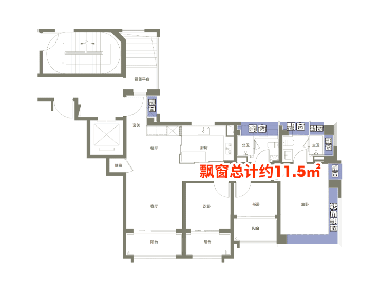 全屋应飘尽飘,主卧配备270°超大转角飘窗+主卫多角度飘窗,飘窗赠送约11.5㎡。