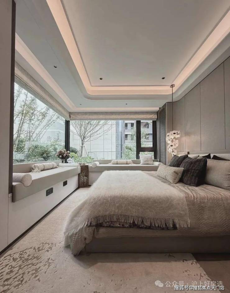 电视背景墙采用卡慕白的石材+皮革造型,弧形吊顶,相当讲究,连空调出风口的形状都打造为海上·清和玺logo山茶花的形状~~三大件为大金(或同等档次)中央空调和地暖,新风系统为百朗(或同等档次),南向阔景阳台,采光视野一级棒!