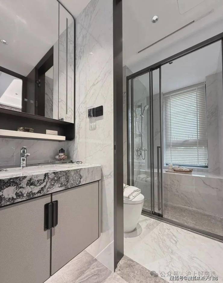 奢石台面,皮革饰面柜抽屉,侧端设置金属收纳开放格;定制镜柜,中间的透光玉石直接提升了高级感,镜柜内部配备了美妆冰箱+美妆灯条+轨道收纳!