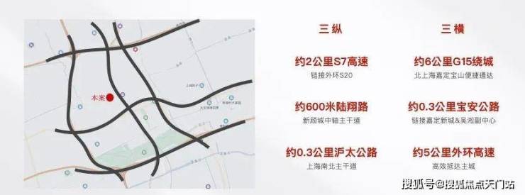 自驾,3高速3干道,转瞬之间通达全城;S20外环高速,距离项目约5公里;G1503绕城高速,距离项目约6公里;S7沪崇高速,在项目西侧约2公里;沪太公路;南侧约0.3公里宝安公路,贯穿宝山和嘉定,约600米陆翔陆,连接新顾城中轴主干道。