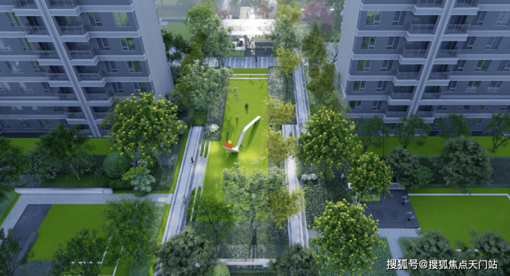 以小区中轴景观线打造自然、轻盈、明快的户外社交空间、包含共享草坪(邻里社交)、超引力客厅(互动投影)、全龄活动设施(健身活动)、四点半学堂(儿童玩乐)。