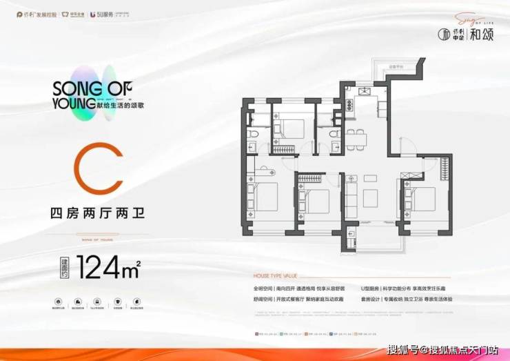 建面约124㎡四房,2梯2户的入户设计,舒适度跃升的同时,满足了高端人群的极致私密性及安全感,去连廊化设计,整个户型从前到后的全通透采光,奢想高端人居体验。
