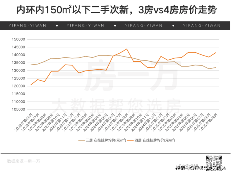 我获取了内环内120-150㎡3房和4房的二手次新房挂牌价走势,很明显4房在市场逆行期韧性更强。