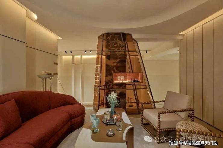 更加别具一格的设计在上方的负一层创意临展空间,透明的茶色玻璃壁炉贯穿于此,金属镶边与定制家具相应和,与华丽红沙发一道,应和着海派Art Deco风情,延展出融合历史与文化格调的能量回旋。