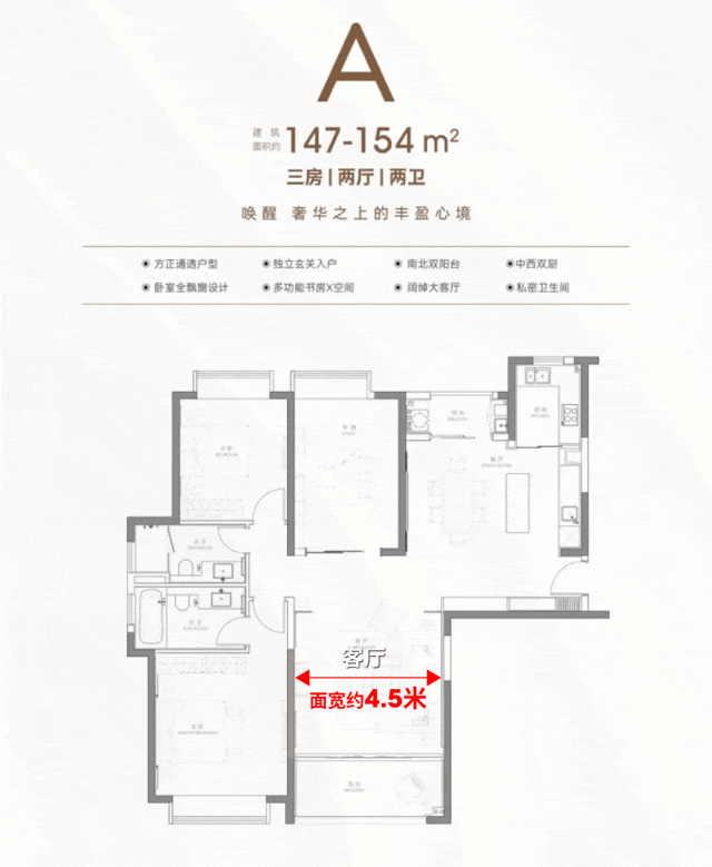 A户型客厅面宽达 约4.5米 ,主卧面宽达约 4米 。
