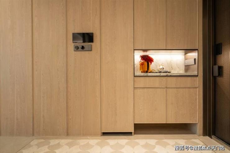 值得一提的是,整个玄关柜是 天然木皮鸡翅木包裹,用料昂贵。并且与墙面、地板几乎一个色系,营造一气呵成的视觉观感,传递出一种低调内敛的豪华感。