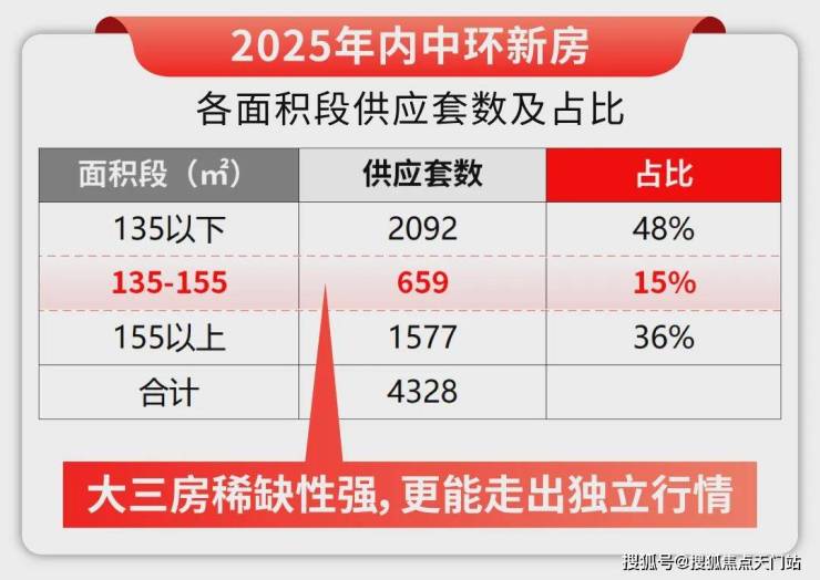 对比市场:百平米或120㎡左右三房空间紧凑,难满足舒适需求;155㎡以上四房总价偏高。该面积段大三房既能保证空间宽敞,又能控制总价,稀缺性显著。