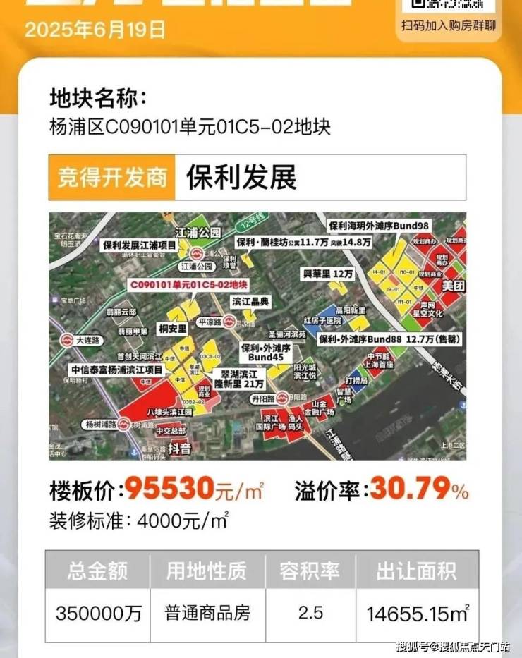 今年5月, 杨浦区N090602单元L4-0 2地块出让,出让结果:以 总价424063万元成交, 溢价率约26.3%、楼面价80199元/㎡。