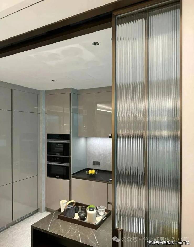 厨房玻璃门是 上轨道移门,意味着地面部分没有任何轨道,不会有灰尘积攒,炒菜时关上,避免油烟散入室内;平时拉开,可以扩充室内视觉感受。