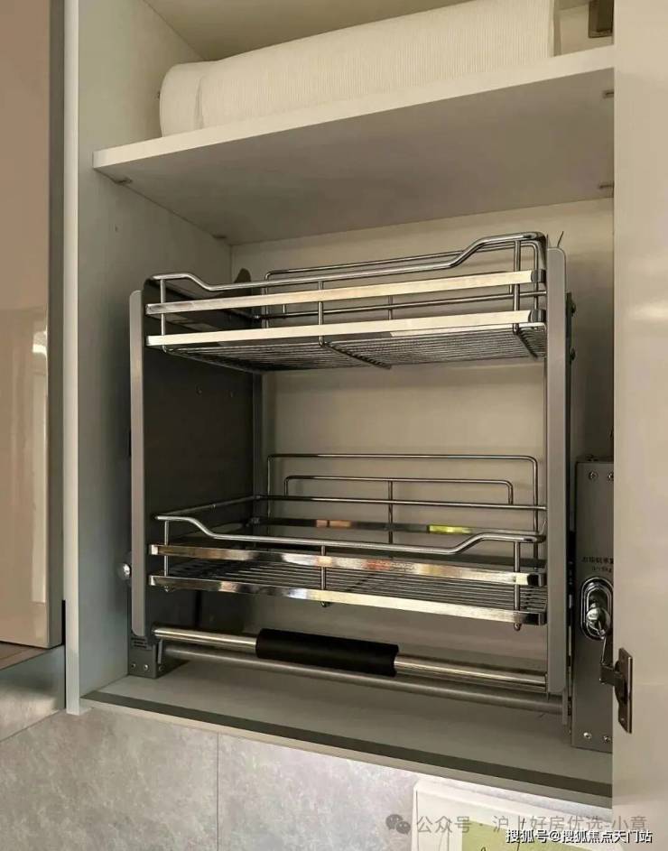 橱柜作为强功能性的收纳系统,自然少不了操作性能上的考究,吊柜做了 升降式的拉篮,以后再也不用爬上高凳拿取了。