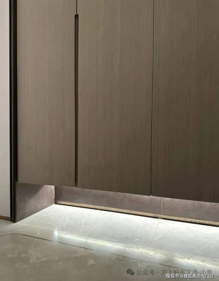 鞋柜下方做了 悬浮处理,同样也是 内嵌灯带,这里灯光的角度还会再调整,因为灯光映射在大理石地面上,要显得尽量柔和不刺眼;同时,鞋柜下方可放拖鞋,还能放扫地机器人,便于日常清扫打理。
