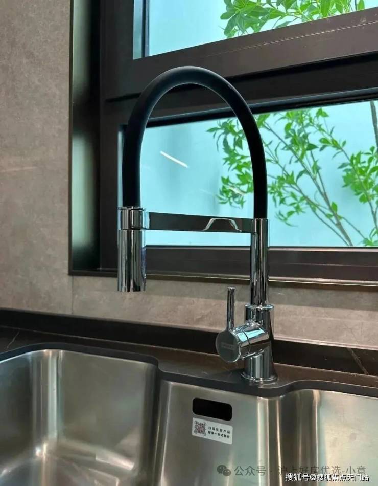 水槽也是一个 大单槽,放得下炒锅汤锅这种大物件~ 抽拉式龙头,清洗大水槽的时候很方便,360度旋转伸展自如,这款弯管还是 硅胶材质,柔软耐用有弹性,还可切换出水模式,出来的水柱也是很柔和细腻不飞溅。