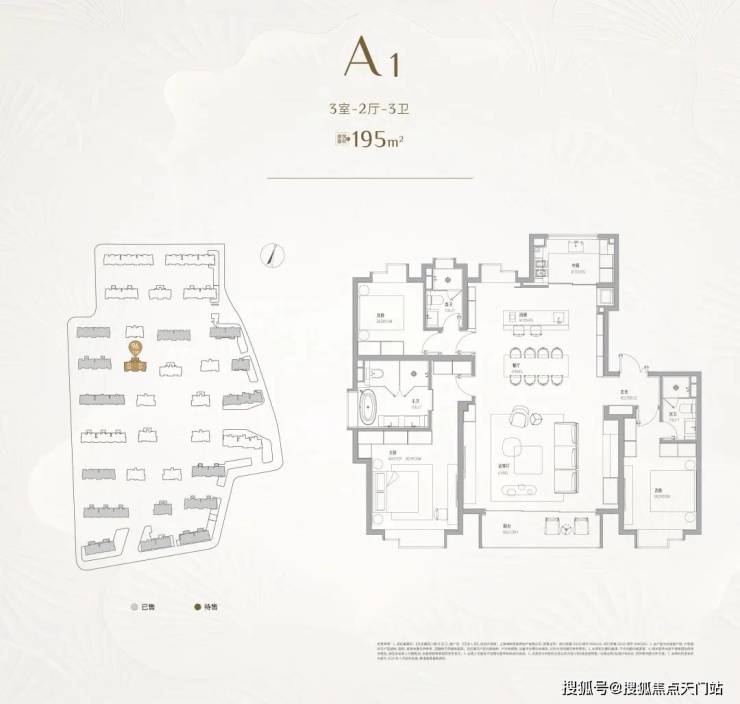 建面约195㎡3房是天安1号首次入市的产品,也是整个项目最高舒适度的产品。它位于社区的中央,楼下就是中央景观轴,视野、采光都相当出众。超大尺度感的客餐厅,东西双厨的设计,更符合当代城市菁英的需求。三套房的设计,每一个卧室都是普通豪宅主卧的尺度感和标准。没有短板的户型,真正的顶奢产品。