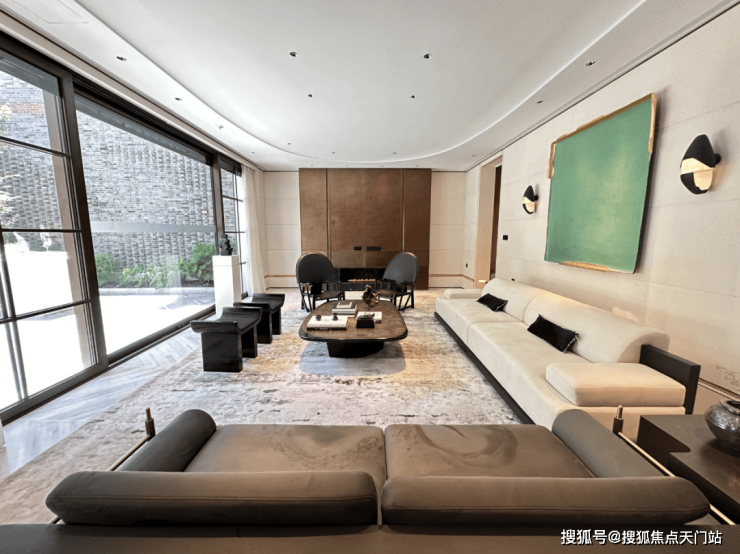 整个泳池天花板,呈现出海派拱形元素,落地玻璃窗外,是下沉式的景观空间:
