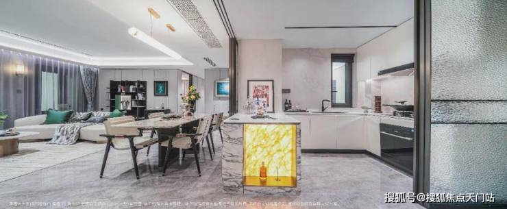 厨房所有墙面均采用 大面积岩板 ,并且采用移门处理, 水波纹玻璃 不仅提升了质感,更减少了室内空间互相之间的阻隔感;