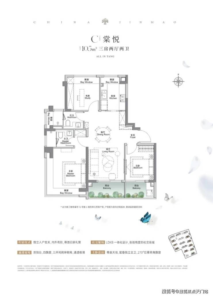 建面约105㎡3房2厅2卫,做到了 三开间朝南+4个飘窗+双面阳台系统+主卧套房设计+270°转角飘窗,附加空间非常多。