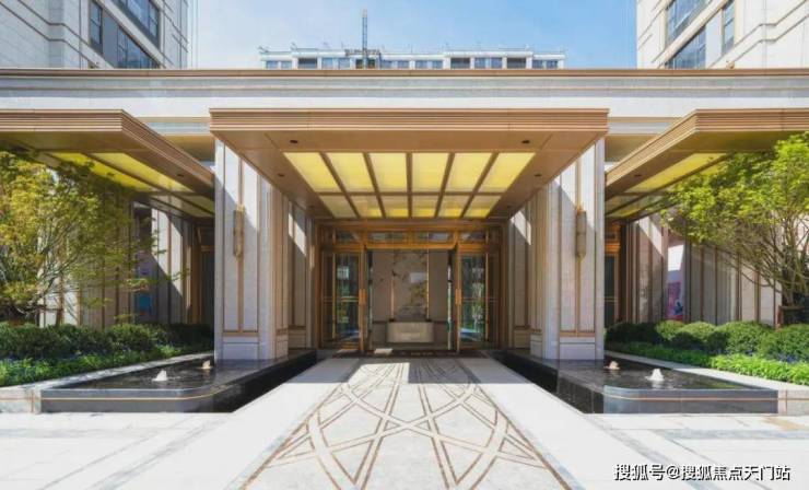 入口中轴对称式的前厅水景,两侧阵列由榉树围合组成,不仅拥有“门前中举”的美好寓意,也让入口的仪式感拉满,与灵动的喷泉水景交相辉映,形成具有东方礼序的归家体验。