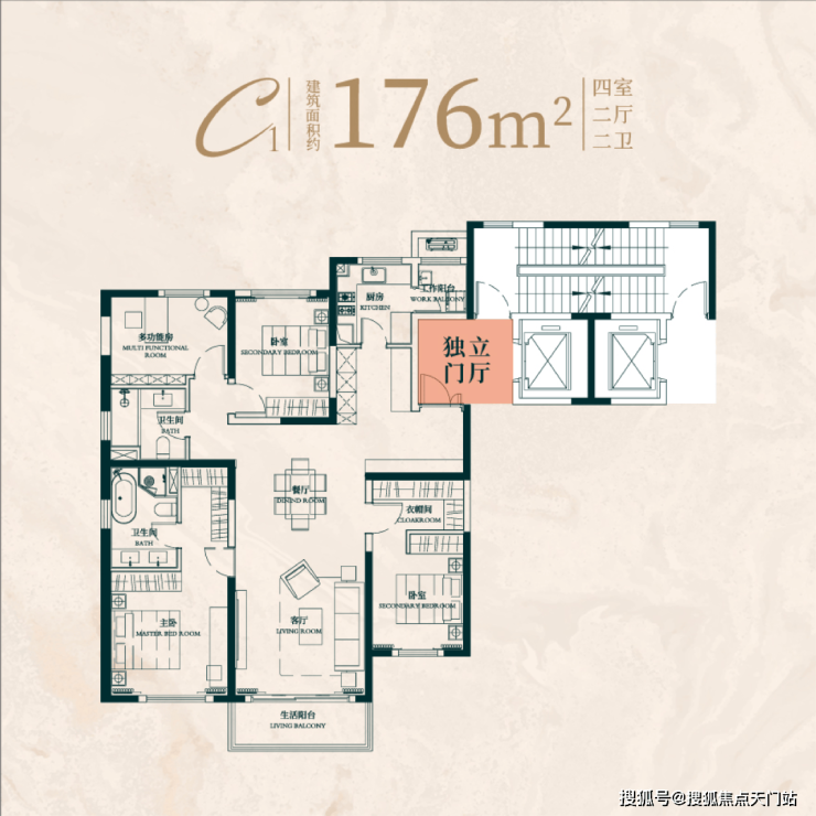 该户型的亮点是 双套房 的配置。而且你仔细看,2个套房分列客厅左右,并且配置极为相似。这样两代人不仅保持了各自独立性和私密性,在舒适度上也接近。
