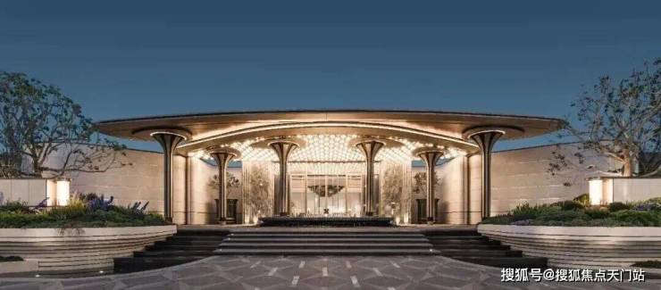 项目恢弘大气的门头,项目设计师以浮岛为灵感,将几根立柱化作悬浮的雕塑,撑起一片轻盈的仪式感。