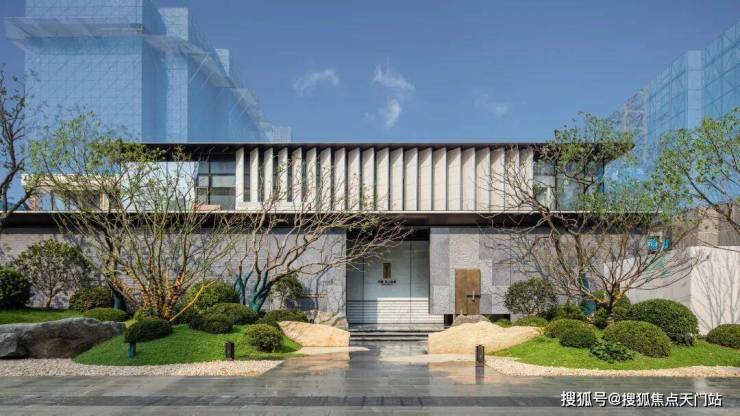 浮光池院水院会客厅,现已实景呈现,水景中央的艺术小品,如一滴水在湖面晕开,泛起阵阵涟漪。