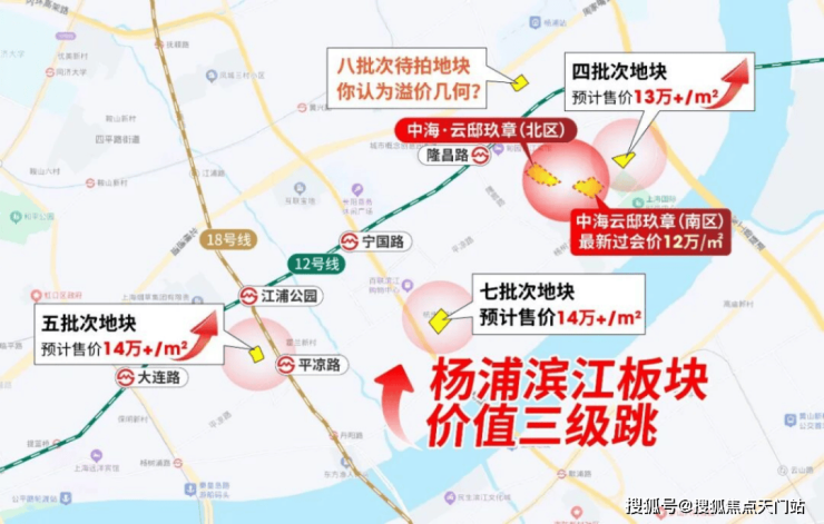 今年的杨浦滨江摁下房价加速器,土拍经历从6.9万/㎡—9.2万/㎡, 涨约30%! 新房未来预计也将 迈上13-14万/㎡!