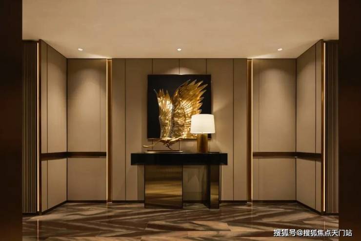 这份体验从电梯厅开始,地面采用奢石拼花,虚实结合的造景将归家仪式感发挥到极致。
