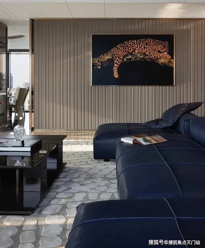 简洁有力的皮革家具充分彰显了空间的张力,金属色豹型装置如空间中灵动的一笔,增加了艺术性释放了松弛感。