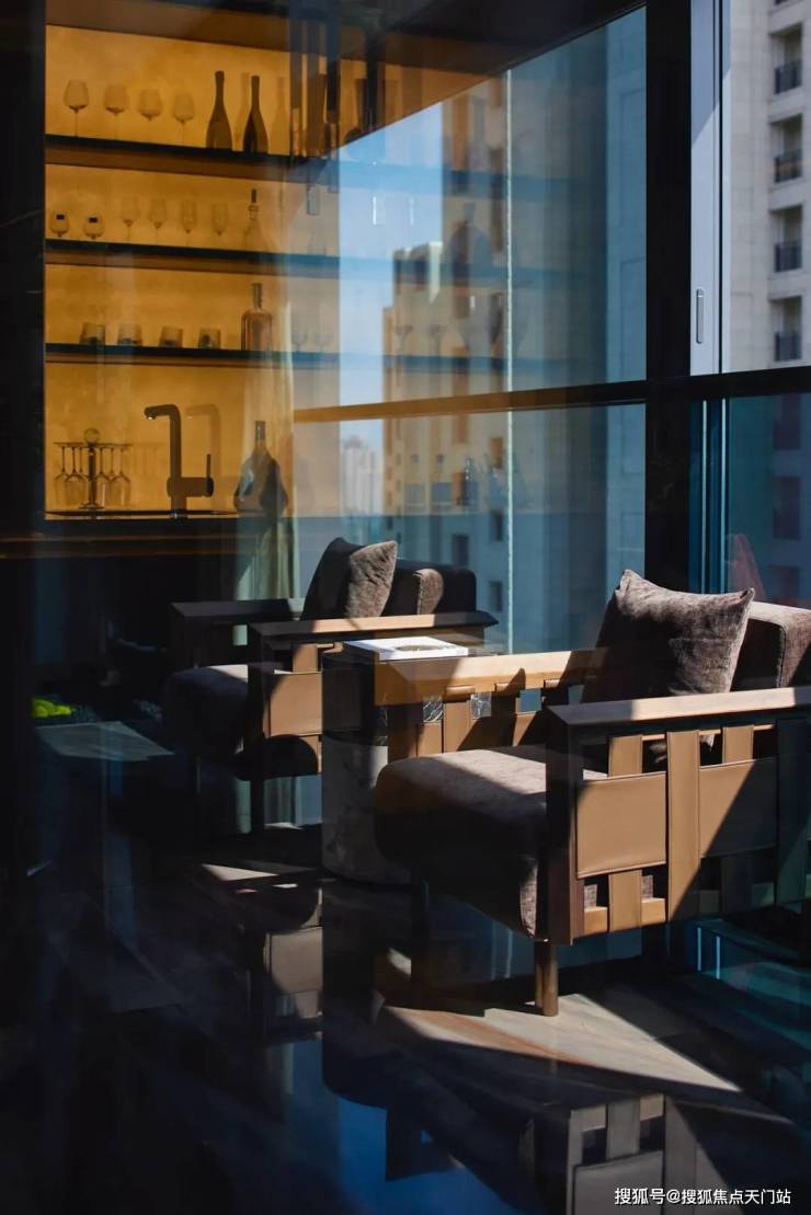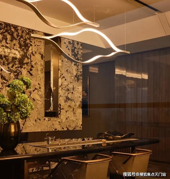 品茗区蜿蜒精致的艺术吊灯,在茶室空间的上空以及金色光影的映衬下,更有了一丝空间的灵动感,座垫编织双厚度皮革杜兰戈结合金属一起,将整体空间的低调奢华隐隐呈现。