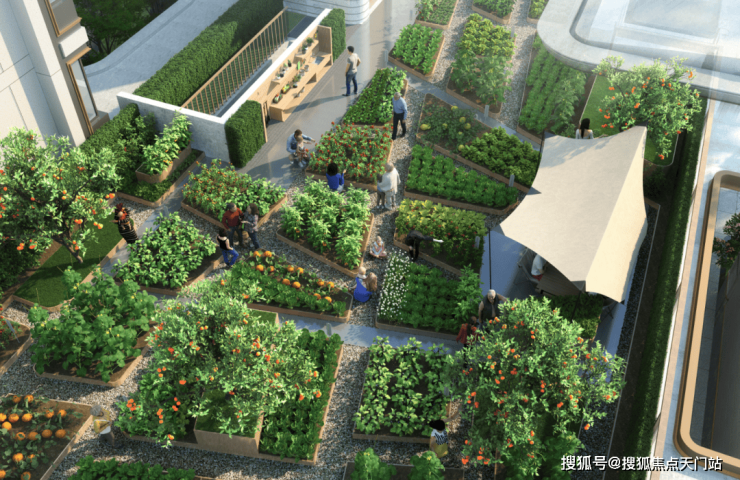 参考成都麓湖生态城沚院项目,回应深植国人心中的田园情结,在配套用房屋面打造 都市菜园