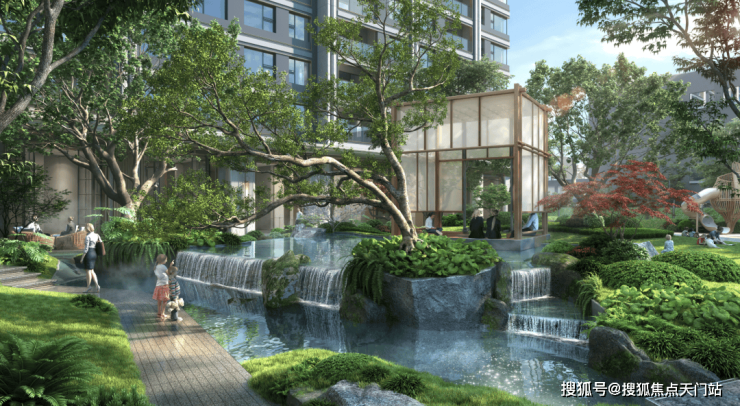 反复考量水景面积、叠水水深、水体吨数,精确计算出能耗比,最后将社区约300㎡的水景区域,科学划分为5个相互呼应的独立模块,并分别配备循环系统,结合业主每天的生活场景,规划不同模块水系开放时间。