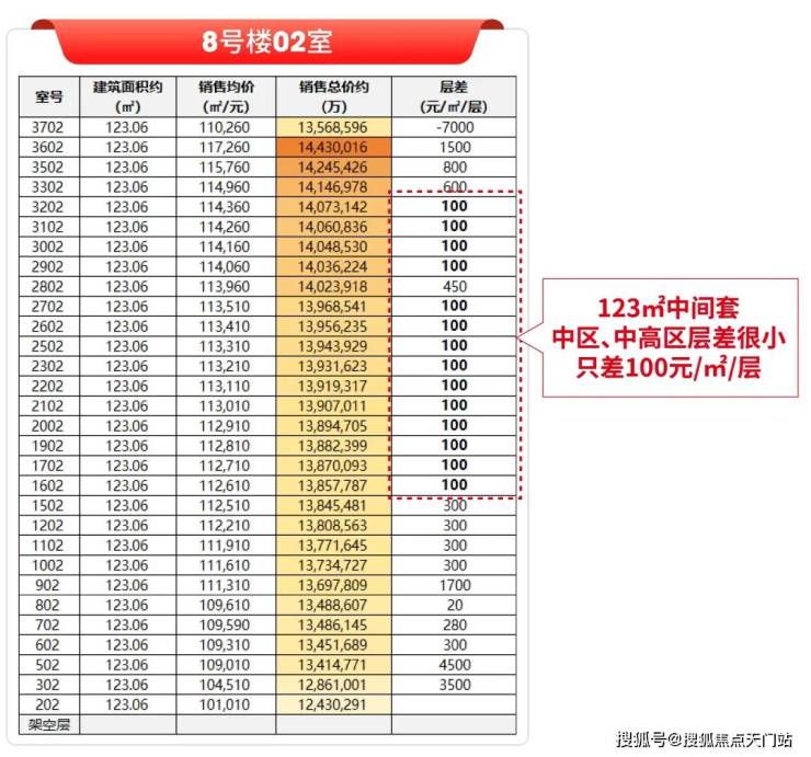 除了显著的均价优势外,中海本次在楼层定价策略上同样诚意十足,主要体现在高中低区优势均衡、楼层价差小、中间套性价比突出三大维度。
