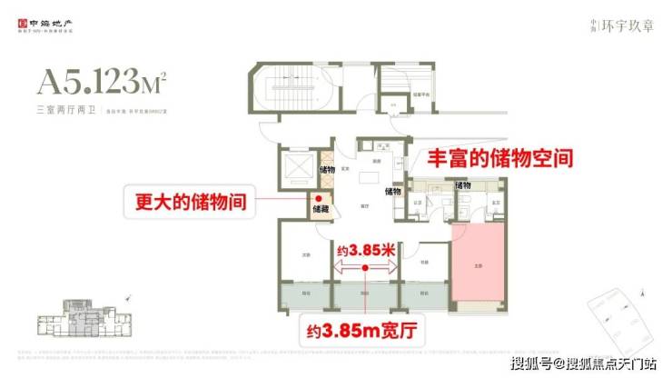 户型设计上,中间套客厅拥有3.85米的开阔面宽,并配备同级更大尺度的储藏间及丰富储物功能,兼顾采光、收纳等实用需求。