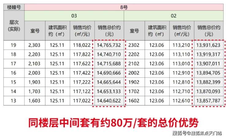首先,中间套与同楼层边套相比,总价差约80-90万,差额相当于一辆豪车价。