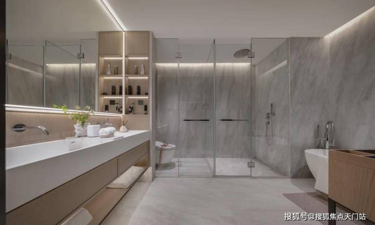 选材上也是相当精细!严选成本高昂的大规格进口瓷砖,减少墙面拼缝,呈现 顶级星级酒店卫浴的整体感,达到目前样板间的高阶精装效果~