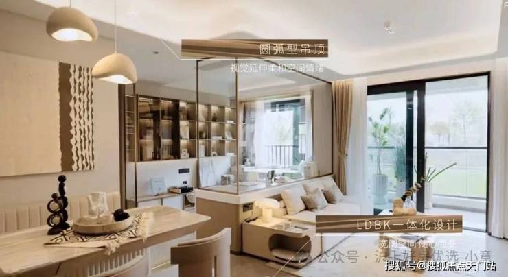 客厅空间也同样运用了更加舒展视觉的圆弧形吊顶和当下最受欢迎的 LDBK一体化 设计: