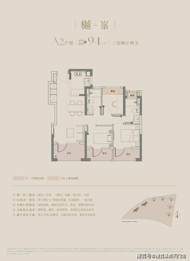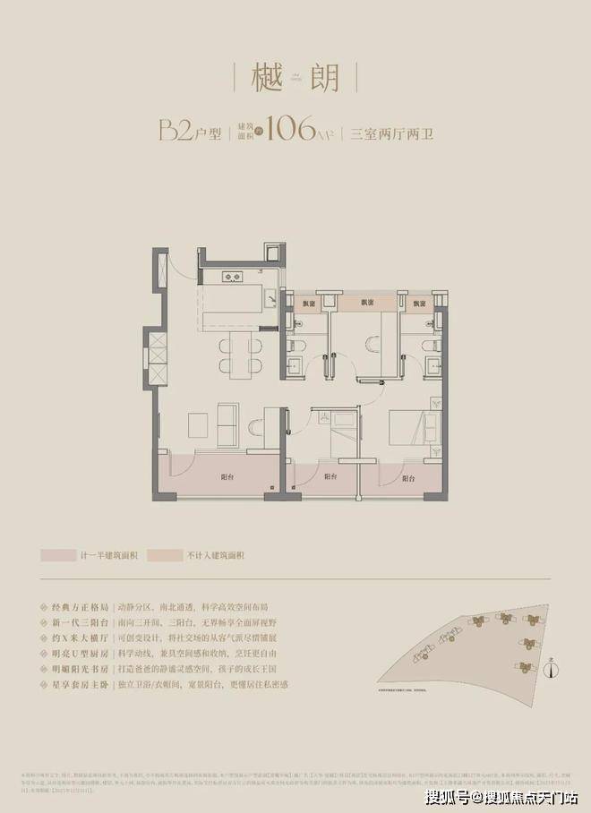 建面约106㎡的三房两厅两卫,3.5开间朝南,南向面宽达到约11.8m!碾压市面上以前的三开间朝南、10米面宽的三房户型。