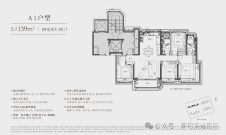 建面约139㎡4房户型,套数不多,但产品力绝对惊艳。四开间朝南,约15.05米宽的南向横厅、约1.6米进深的奢阔阳台,中环顶级享受的既视感。主卧约4.45米的进深,约4米大面宽(含飘窗),配合270°转角飘窗,是目前市面上产品力高配的户型之一,值得一冲!