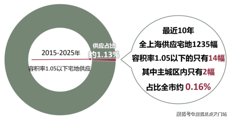 据克而瑞数据统计,2015年-2025年这十年,全上海累计供应1235幅宅地,其中容积率≤1.05的一共只有14块,占比仅约1.13%。更重要的是,这些低密地块绝大多数都地处郊区,主城区的凤毛麟角,仅有2幅!