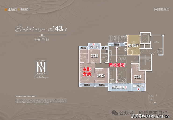 项目建面约143㎡户型的设计无疑是市场一流水准,一梯一户保证私密性和尊崇感;四开间朝南+大宽厅,采光效果爆棚;主卧贯穿南北套房设计,南北都有飘窗,舒适度可圈可点。