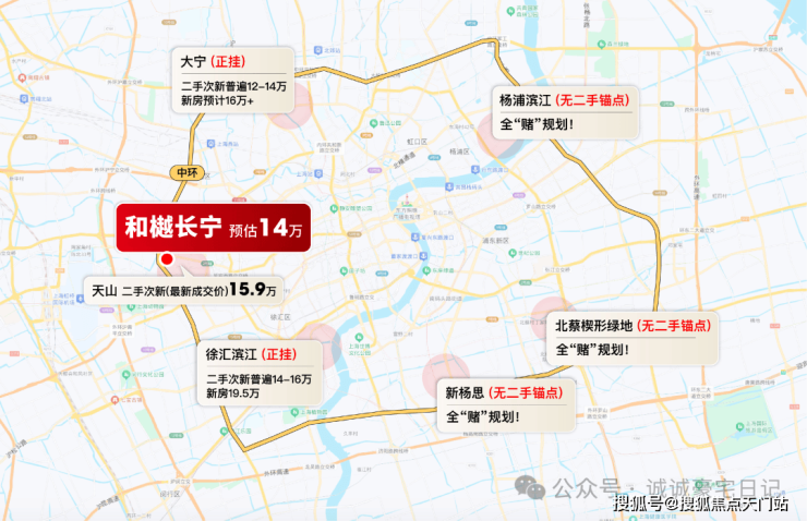 既然天山路住宅收官,我们放大视角来看周边新地:与和樾长宁同环线的吴中路光明乳品厂地块预计售价至少16-18万/㎡(旁边的古北壹号挂牌价超过22万/㎡)。与和樾长宁同2号线的中山公园地块预计售价或超过20万/㎡。