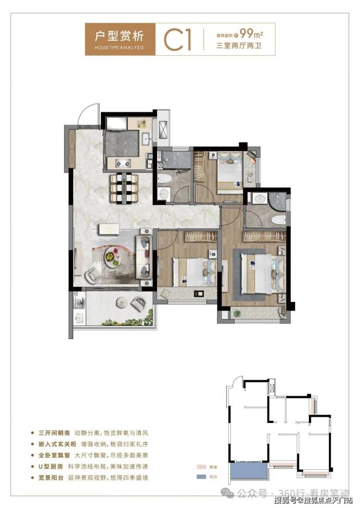 · 99㎡三房:南北通透,三开间朝南,全卧室飘窗,同样拥有超大赠送面积。配有嵌入式玄关柜,增加了收纳空间。