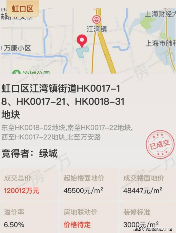 其中,虹口江湾地块容积率2.25-2.5,溢价率6.48%,楼板价48447元/㎡,装修标准不低于3000元/㎡。
