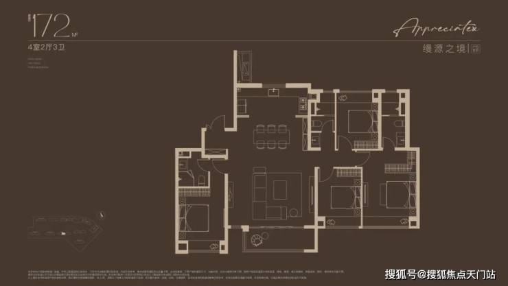 建面约172㎡4房户型,多娃家庭的进阶之选!奢阔尺度尽显家族气度!2梯2户, 子母双开门礼序入户,私密尊崇门厅;约 16米四开间朝南 ,搭配约 6米尺度横厅 ,揽四时风景入怀。