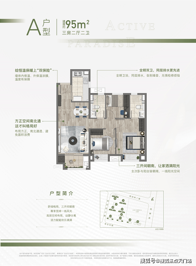 1、约95㎡的三房,南北通透,全明设计,三开间朝南,户型方正。