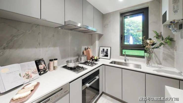 第五个亮点, 宽阔的L型厨房,两面靠墙,灶台和水槽布置空间充足,实际使用能够满足各类烹饪需求。