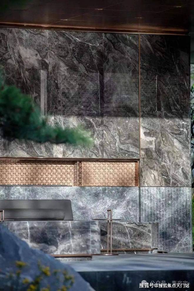 水景一侧是一段曲折幽静的星空连廊,能遮风挡雨的同时,也能提供游园般的归家体验。星空连廊的顶面采用香槟金铝板、墙面为爱马仕灰仿石砖,并镶嵌金属线条、就连地面都采用了夜里雪仿石砖第四,由石材&铝板构筑的第二景观会客厅!